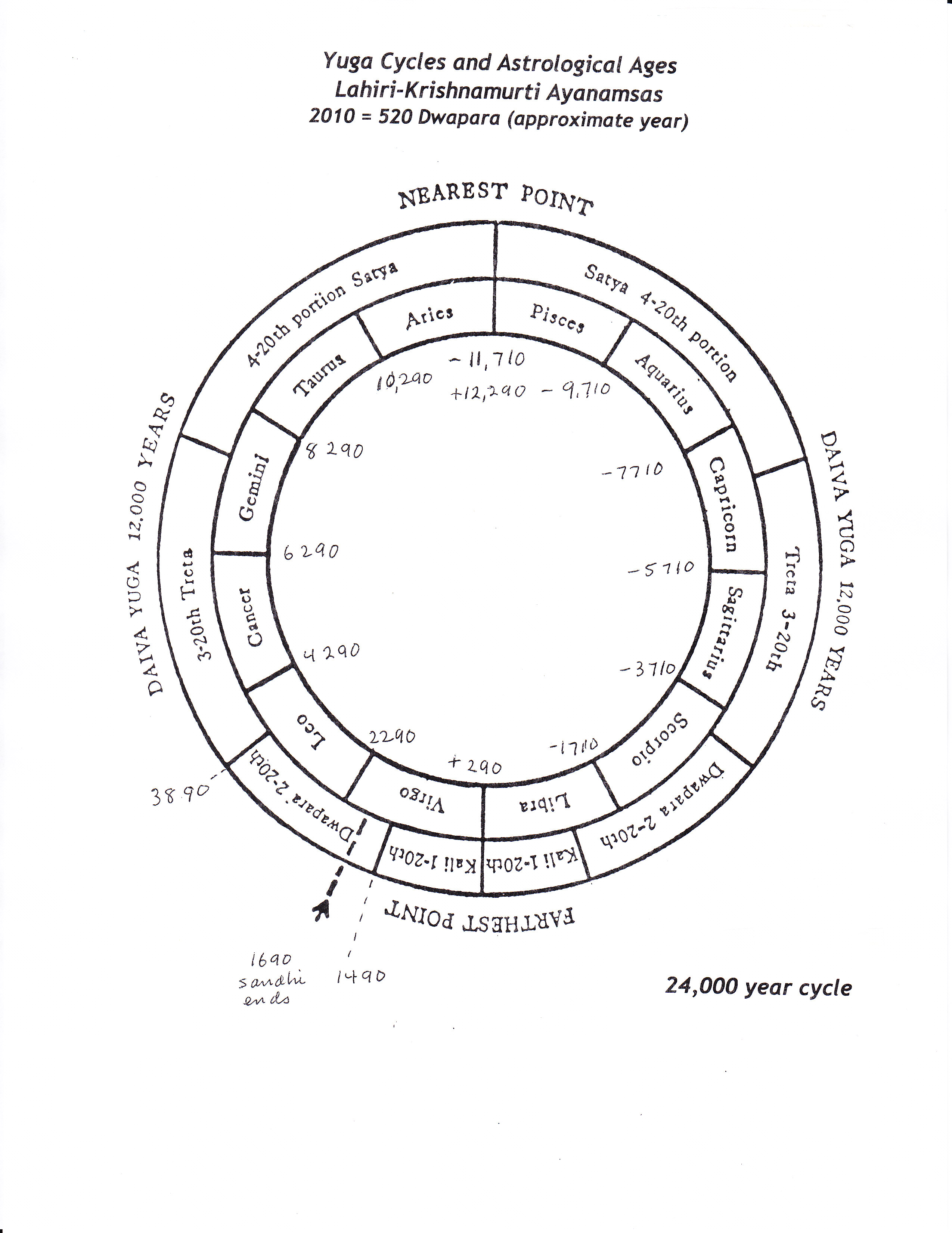 Its been said that in the interests of working harmoniously with the committee, Lahiri departed a few years from the year he calculated to be the correct zero date. But I cannot verify that as a fact. Perhaps the Committee wished to place Spica at exactly zero of the sign Libra, which is the placement of the star with the Lahiri ayanamsa. Using 290 as the zero date, now in 2010 we would be in 520 Dwapara within the ascending 12,000 yuga cycle. The exact year doesnt matter so much as long as yuga dates arent the official accepted world timing method.