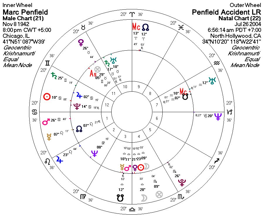 Astrologer Marc Penfield was sitting in a local coffee shop having his morning tea and reading the newspaper when a truck crashed through the restaurant and nearly over the booth where Marc was sitting on July 30, 2004 at 8:08 AM in North Hollywood, CA He was rushed to the hospital where they removed his spleen and 40 per cent of his pancreas. He also sustained injuries to one of his left ribs. Marc was in the hospital for 11 days and is home recuperating now. He thinks two other people were also injured in the accident, but were taken to other hospitals as their injuries were not as severe as his. Marc was born Nov 8, 1942 at 8 PM CWT in Chicago, Illinois.